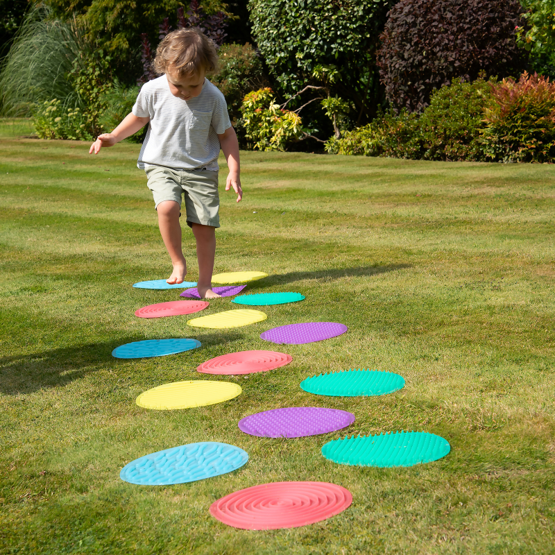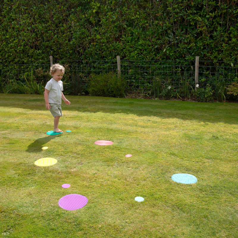 Här får barnen 10 sensoriska cirklar i mjukt silikon – 5 stora och 5 små – där varje cirkel har sitt eget mönster. De kan känna på de små cirklarna i den medföljande påsen eller gå barfota på de stora för att upptäcka skillnaderna.