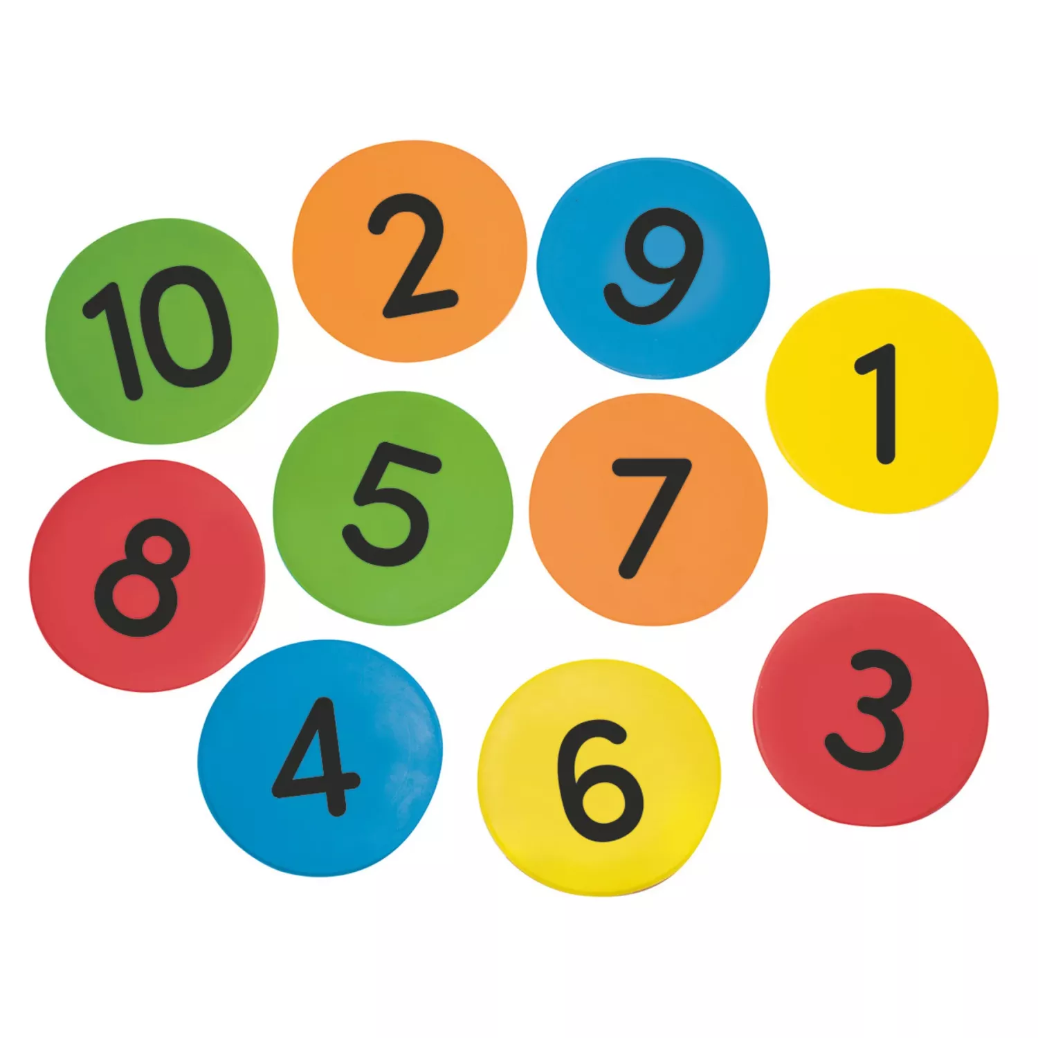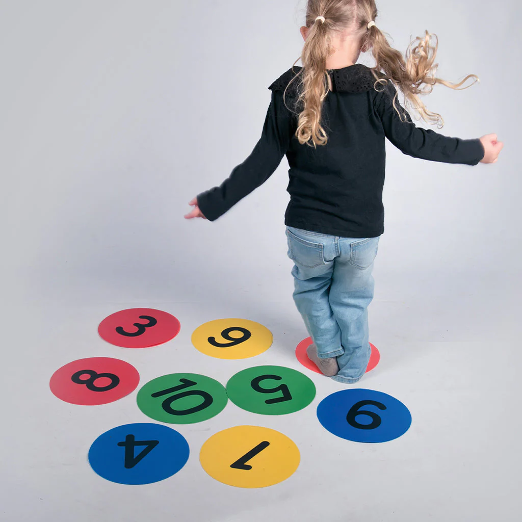 Markeringsplattor med siffror för lek, rörelse och enkel matematik.