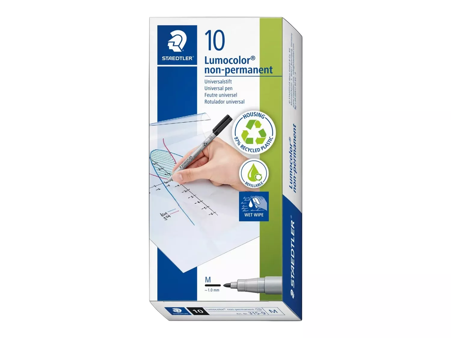 Lumocolor® non-permanent penna tillverkad av 97 % återvunnen pre-consumer plast, för användning på nästan alla ytor.