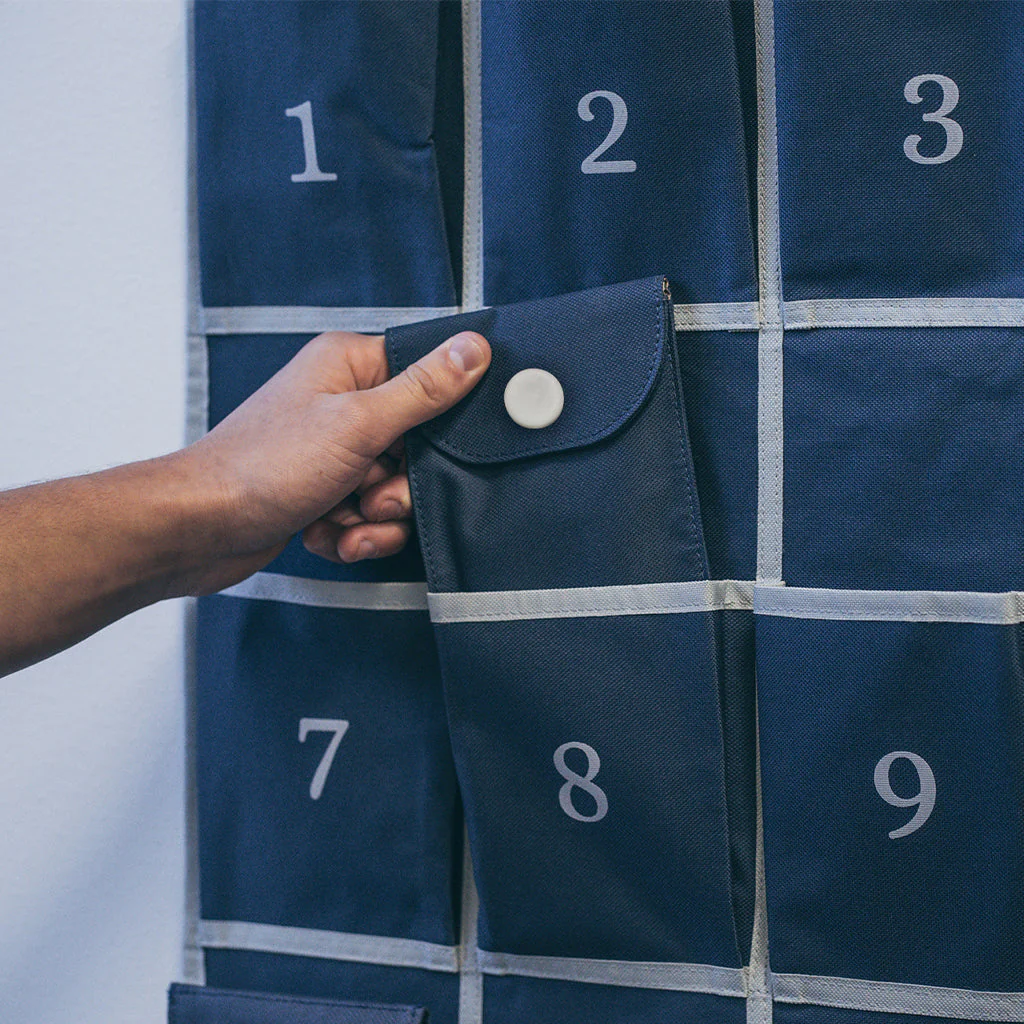 Den numrerade kalenderförvaringen gör det enkelt att organisera telefonerna och hålla ordning på deltagarnas enheter. En medföljande magnetdisk används för att låsa upp mobilfodralen.